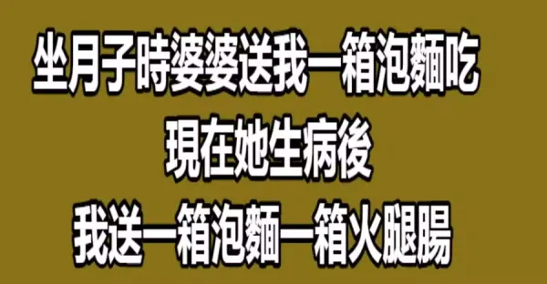 坐月子時婆婆送我一箱泡麵吃,現在她生病後,我送一箱泡麵一箱火腿腸!