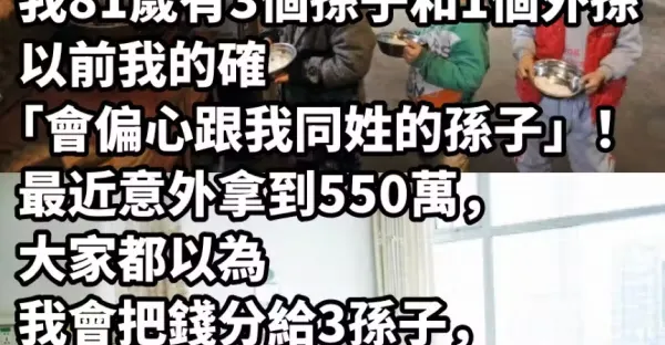 我81歲, 有3個孫子和1個外孫,以前我的確「會偏心跟我同姓的孫子」! 最近意外拿到550萬,大家都以為我會把錢分給3孫子,但最後我決定「全部都給外孫一人」...是我此生做過最好的決定