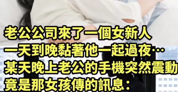 老公公司最近來了一個女新人,一天到晚黏著他,還一起過夜⋯某天晚上,老公的手機突然震動,竟是那女孩傳的訊息:「我懷孕了,你娶我」。當下我沒有發怒「只回了3句話」,成功挽回婚姻!
