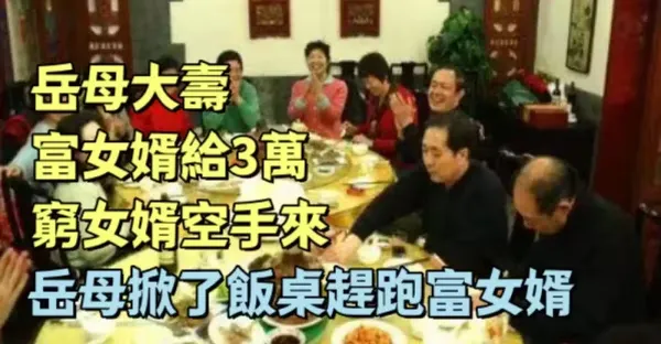 岳母大壽,富女婿給2萬,窮女婿空手來,岳母掀了飯桌趕跑富女婿!