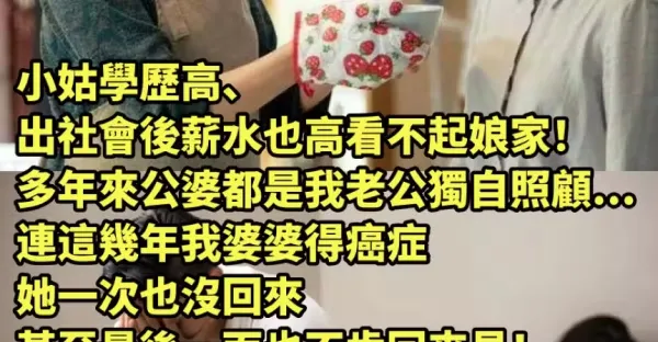 小姑學歷高、出社會後薪水也高看不起娘家! 多年來公婆都是我老公獨自照顧...連這幾年我婆婆得癌症「她一次也沒回來」,甚至最後一面也不肯回來見!結果婆婆「喪禮一結束」她就出現問:媽的房子怎麼分? 我正要為老公說話「下秒老公開口了」