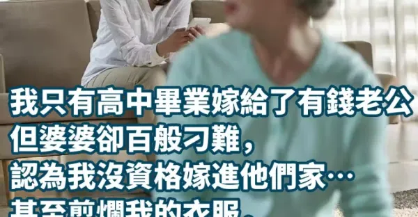我只有高中畢業,嫁給了有錢老公, 但婆婆卻百般刁難,認為我沒資格嫁進他們家…甚至剪爛我的衣服,卻說都是為了我好…..我真的好痛苦,我該怎麼辦?#很怕離婚無法在社會生存