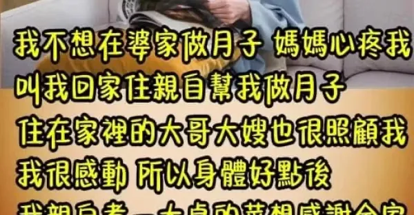 我不想在婆家裡做月子, 媽媽心疼我,叫我回家住親自幫我做月子,住在家裡的大哥大嫂也很照顧我,我很感動….身體好點後我親自煮一大桌的菜想感謝全家,沒想到「5歲小侄女冒出一句話」我連夜抱剛出生的兒子搬走 #發誓再也不回娘家住
