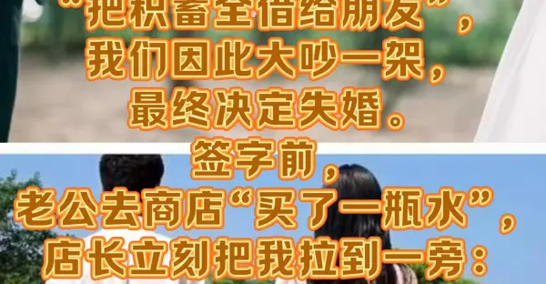 我與老公結婚7年,前幾天他被我發現「把積蓄全借給朋友」,我們因此大吵一架,最終決定失婚。簽字前,老公去商店「買了一瓶水」,店長立刻把我拉到一旁:姑娘, 這婚離不得...