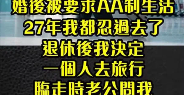 婚後被要求「AA制生活」 27年我忍過去了! 退休後我決定「一個人去旅行」,臨走時老公問:「你去多久?誰做飯給我吃?」我「淡定回一句」讓他說不出話