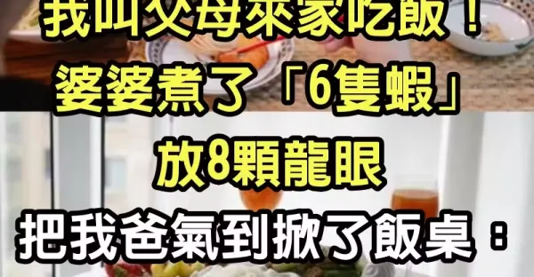 我叫父母來家吃飯!婆婆煮了「6隻蝦」放8顆龍眼,把我爸氣到掀了飯桌 :太過分了