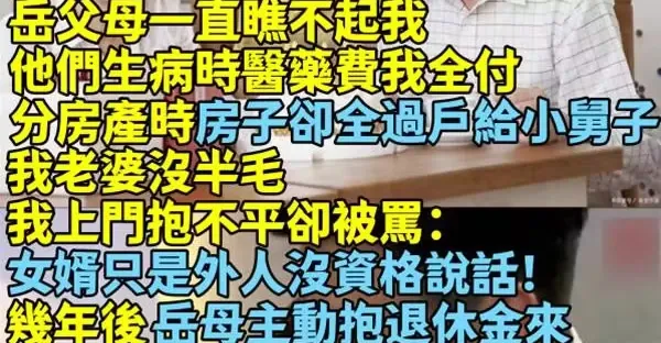 岳父母一直瞧不起我...他們生病時醫藥費我全付! 分房產時「房子卻全過戶給小舅子」我老婆沒半毛...我上門抱不平卻被罵:「女婿只是外人沒資格說話!」幾年後「岳母主動抱退休金來」要我們養老, 我一看金額笑了...
