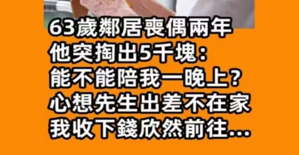 63歲鄰居喪偶兩年!!! 他突掏出5千塊:「能不能陪我一晚上?」心想先生出差不在家,我收下錢欣然前往…