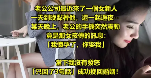 老公公司近期來了一個新女人,一天到晚黏著他,還一起過夜⋯某天晚上,老公的手機突然震動,竟是那女孩傳的訊息:「我懷孕了,你娶我」。當下我沒有發怒「只回了3句話」,成功挽回婚姻!