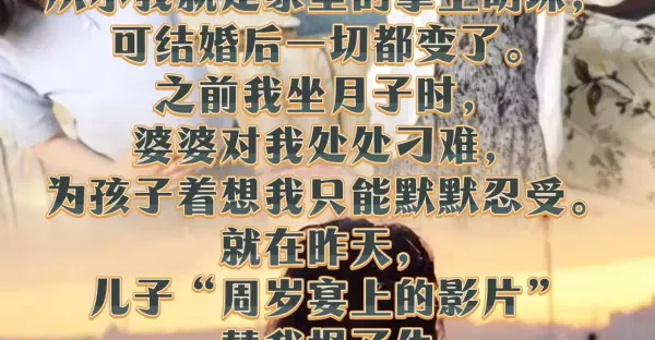 從小我就是家裡的掌上明珠, 可結婚後一切都變了。之前我坐月子時,婆婆對我處處刁難,為孩子著想我只能默默忍受。就在昨天,兒子「周歲宴上的影片」替我報了仇