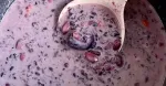2. 將攪拌好的肉餡放入蒸盤中,用勺子壓平。