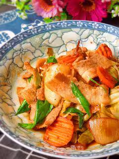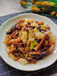 #明德辣豆瓣醬 香辣豆瓣醬腌過的五花肉炒干魷魚.再加青脆高麗菜.回鍋肉的做法非常夠味下飯喔~