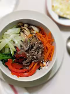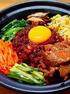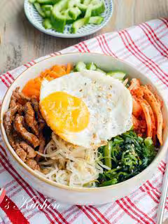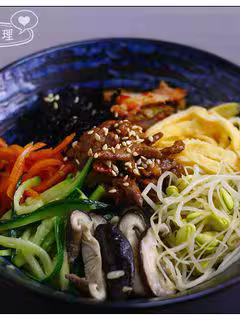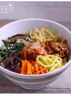 韓文bibim是"混合"的意思, bap是"米飯", 所以bibimbap則是"拌飯"的意思, 說及韓式拌飯以」晉州拌飯」最為出名, 在慶尚道的晉州拌飯, 是全家在宗家祭祖後, 把山菜放在一個大碗里, 拌好後再分到小碗里給每個人吃. 據說這曾是朝鮮王朝時, 向中國皇帝進貢佳肴, 另有一說是拌飯中所擺放的食材中之青黑紅黃白是依據五行顏色來配置而達到養生的目的. 不管以上所說是真是假, 本著有菜有肉有蛋的營養哲學, 讓本廚房也來試做這道韓式餐廳點菜率高居不下的料理吧! 訣竅提示 食材可依個人喜好改變, 雞蛋不敢吃太陽蛋也可煎全熟歐!