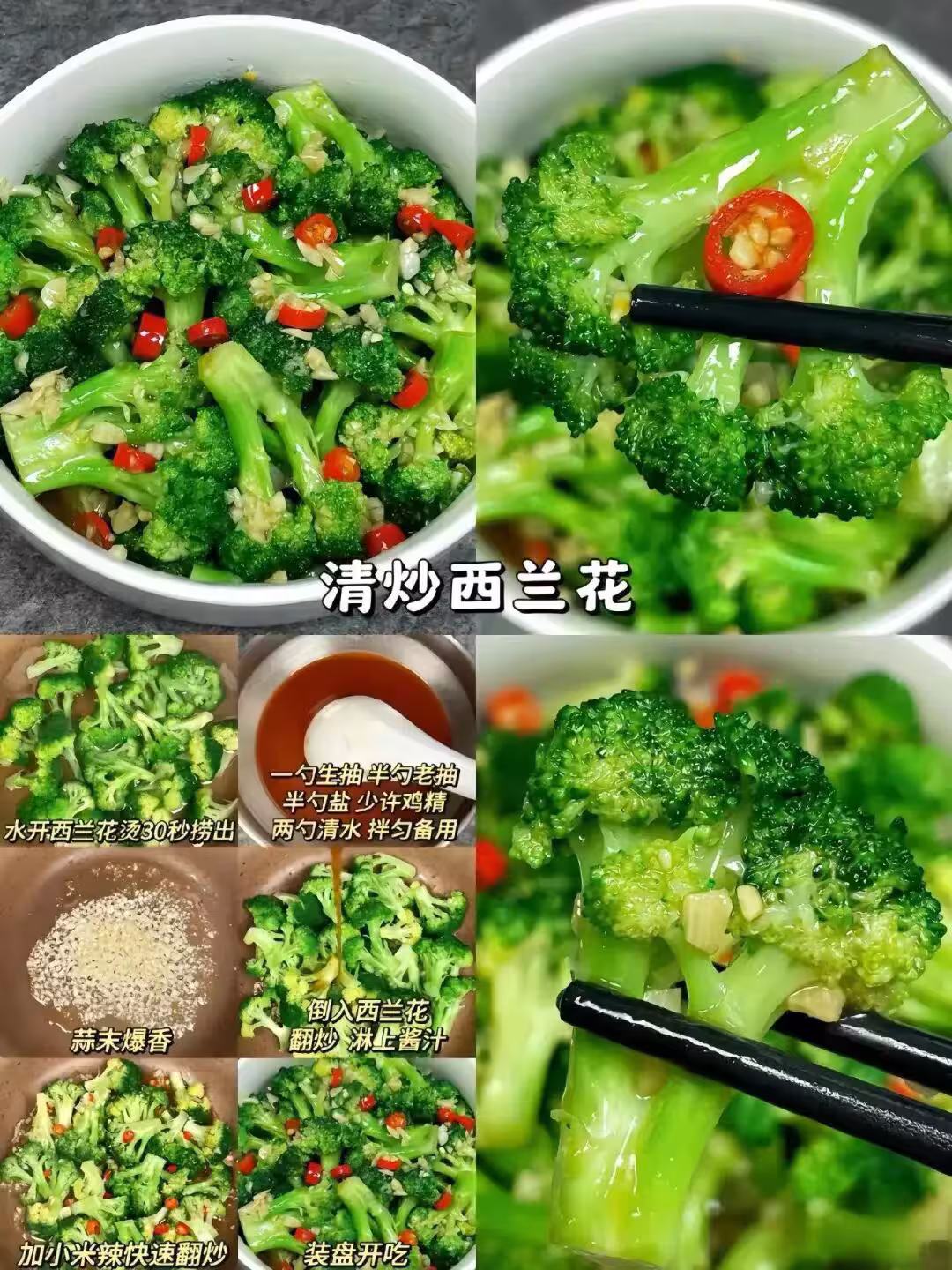 製作步驟: 水開西蘭花🥦燙30秒撈出 一勺生抽 半勺老抽 半勺鹽少許雞精 兩勺清水 拌勻備用 蒜末🧄爆香 倒入西蘭花🥦 翻炒淋上醬汁 加小米辣🌶快速翻炒 裝盤開吃