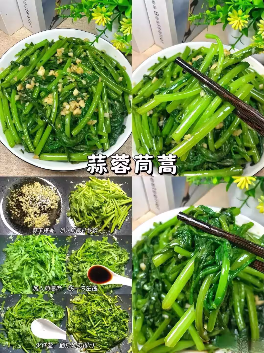 蒜蓉紅薯葉,油熱後蒜末🧄煸香後下鍋,大火翻炒,伴著蒜香特別入味,以前總覺得紅薯葉不起眼,試過才知道有多下飯;最後再來道清炒空心菜,梗子脆、葉子嫩,大火快炒,加上腐乳辣椒🌶椒絲,吃著清爽不油膩。這九道菜做法都簡單,不用複雜調料,青菜🥬本來的鮮味,一家人的營養均衡,從來不是靠什麼補品,就是這些青菜里啊。。