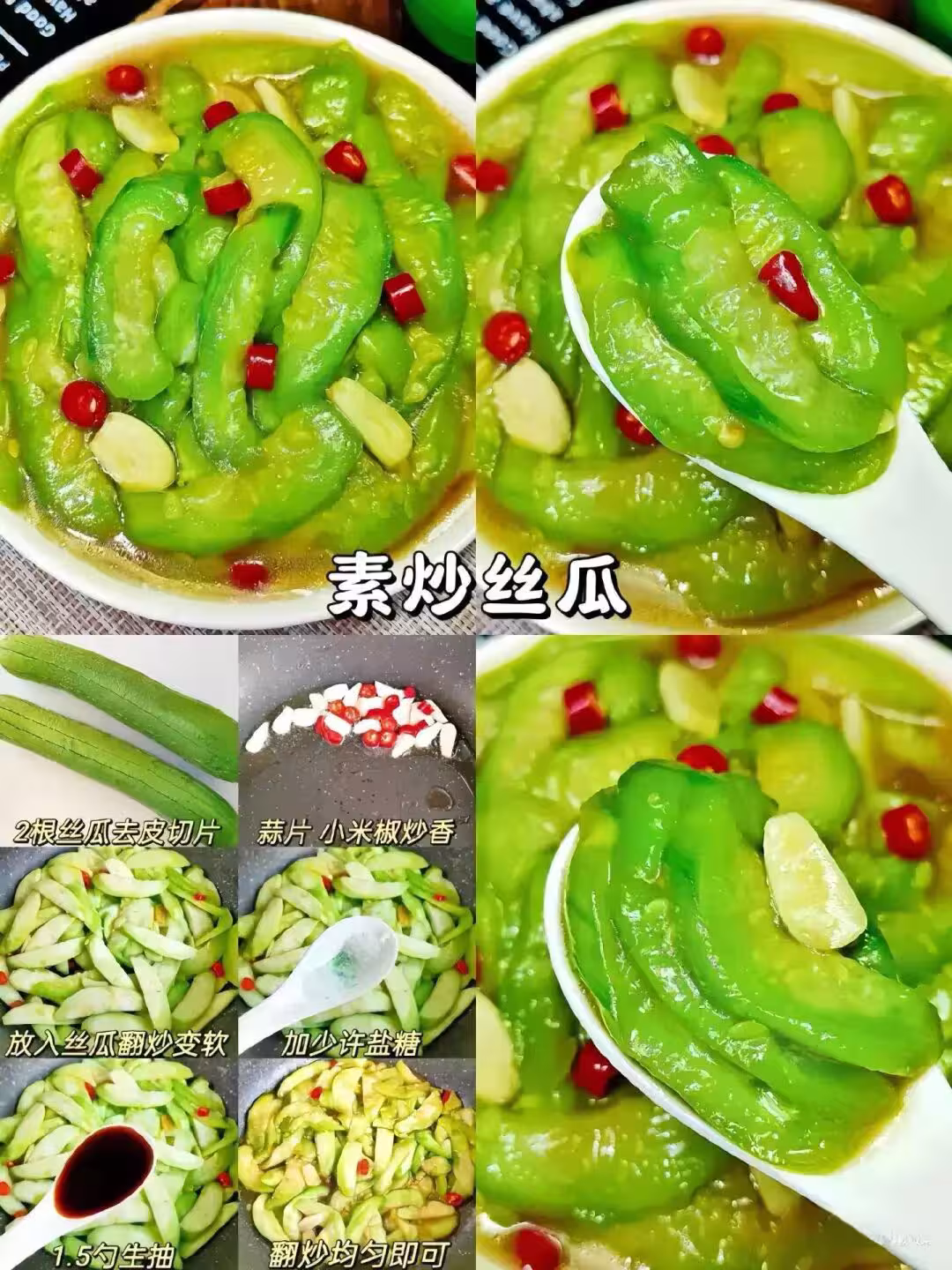 製作步驟: 2根絲瓜去皮切片 蒜片 小米椒🌶炒香 放入絲瓜翻炒變軟 加少許鹽糖 1.5勺生抽 翻炒均勻即可