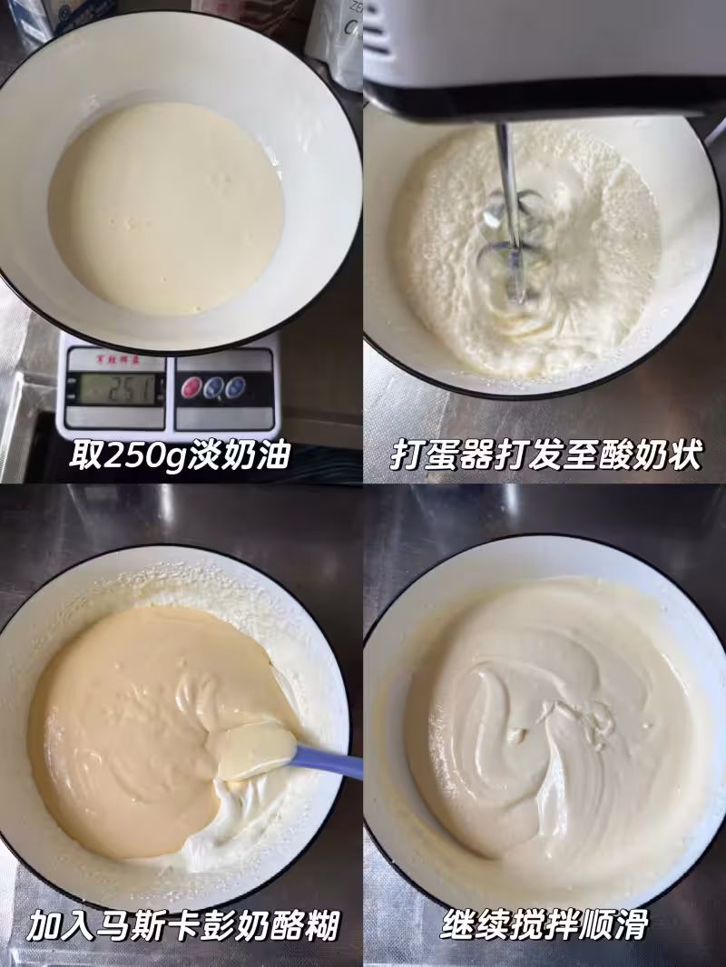 3️⃣淡奶油打發至酸奶狀,和馬斯卡彭奶酪糊攪拌均勻