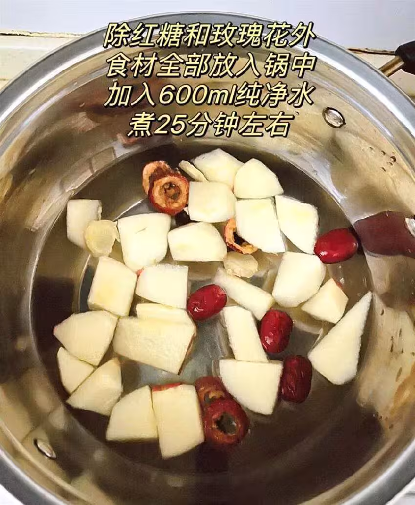 蘋果 1個、紅糖 2塊、帶皮薑片 2 - 3片、紅棗 4顆、桂圓 5顆、山楂 5片、干玫瑰花 6朵