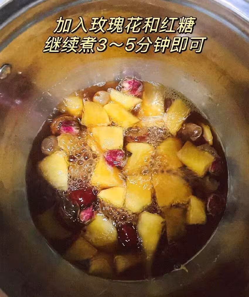 放入紅糖和干玫瑰花,繼續煮3 - 5分鐘即可。