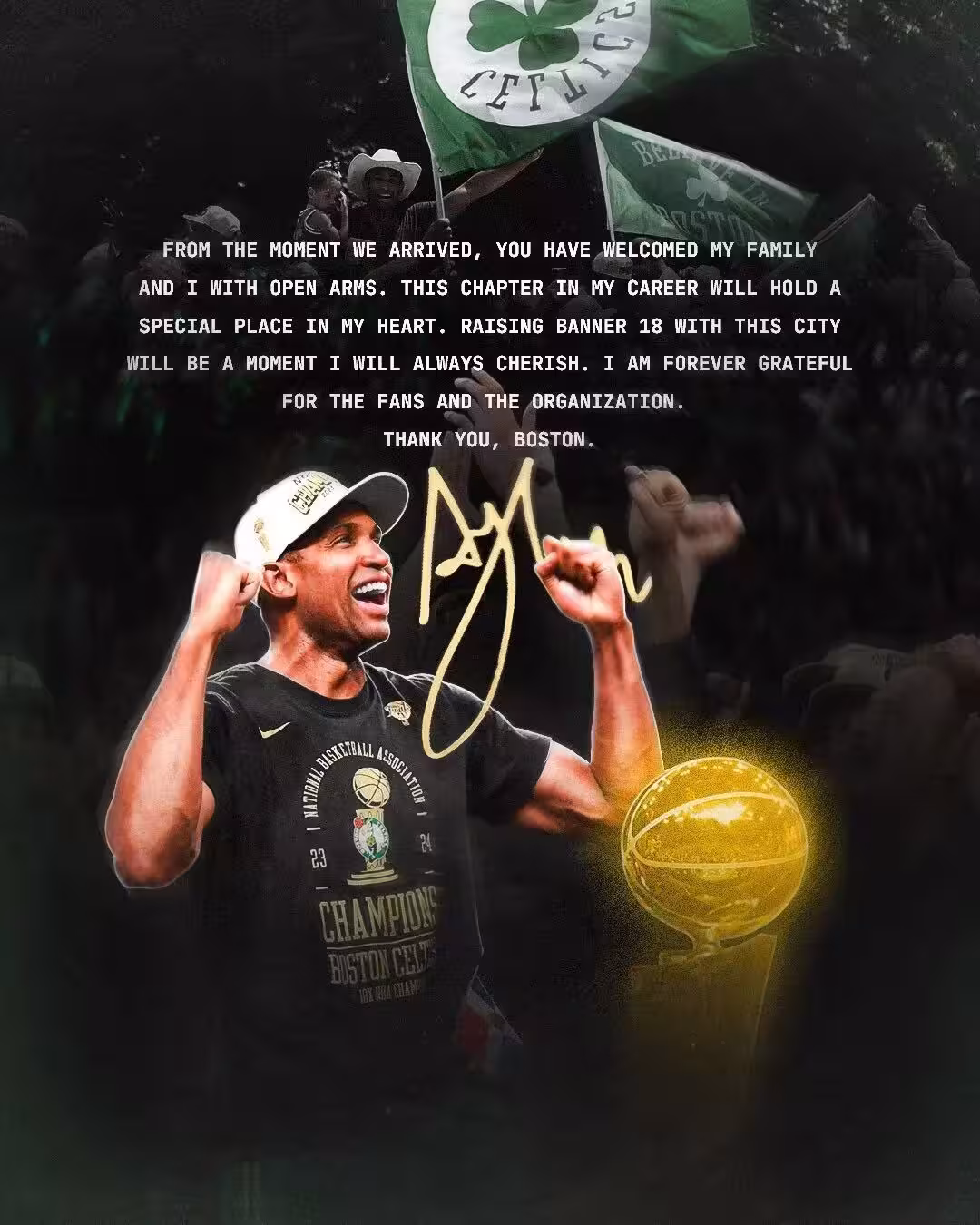 緊接著霍福德更新個人社媒感謝凱爾特人,表示能為波士頓升起第18面總冠軍旗幟將是永生銘記的時刻。