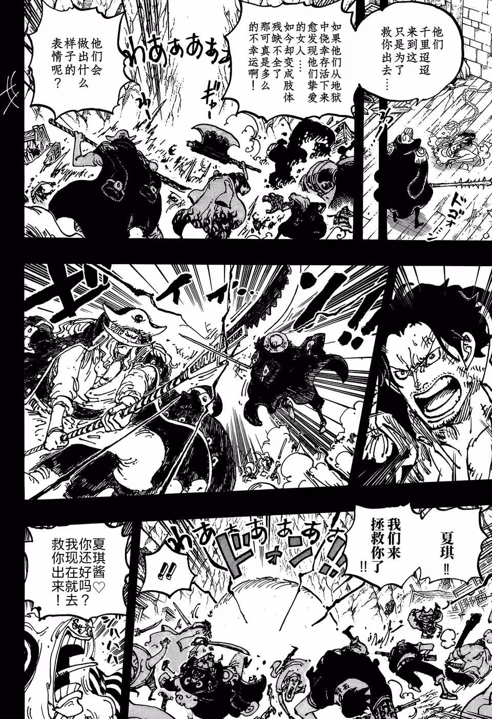神之谷大戰徹底爆發,每個海賊都有自己的目標,天龍人也在責罰海軍,他們帶來的財寶還沒有拿走,海軍讓天龍人趕緊逃跑,財寶的話海軍會幫忙保管,不過天龍人不信。羅傑在尋找夏琪,洛克斯在尋找老婆和孩子,卡普在尋找羅傑。