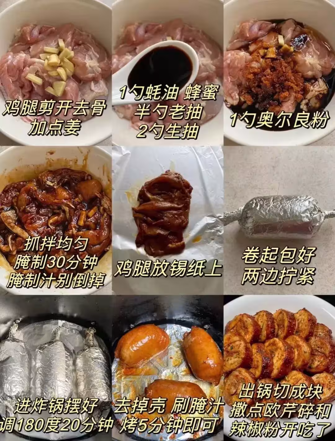 做法簡單: 先把雞腿剪開去骨,加入一些薑片。放入 1 勺蚝油、蜂蜜,半勺老抽、2 勺生抽和 1 勺奧爾良粉,抓拌均勻後腌制 30 分鐘腌制汁留存不要倒掉。 將雞腿放在錫紙上,捲起來包好,把兩邊擰緊。放入空氣炸鍋,180 度烤 20 分鐘。 去掉錫紙,刷上之前的腌制汁,再烤 5 分鐘。最後取出切成塊,撒上歐芹碎和辣椒粉,就可以啦。
