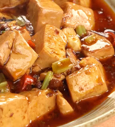 食材:嫩豆腐、素肉末(豆製品)、花椒、豆瓣醬、香芹、辣椒。