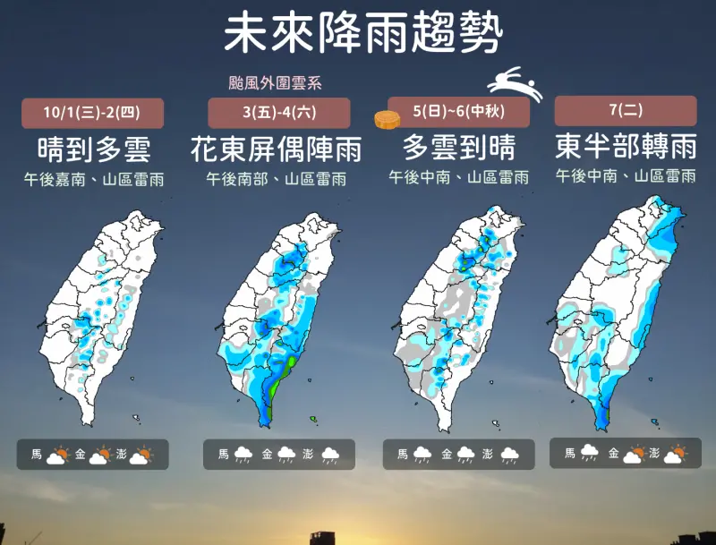 李名翔提及,中秋連假後期的周日、下周一,麥德姆颱風逐漸往西遠離,太平洋高壓依舊強盛,全台回到多雲到晴、只有恆春半島有局部短暫陣雨的天氣,午後在中南部、山區仍會有局部短暫雷陣雨。