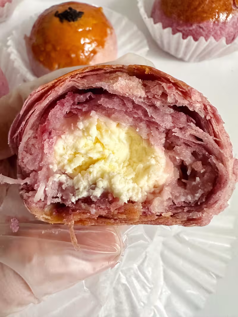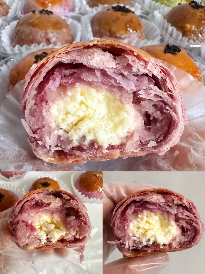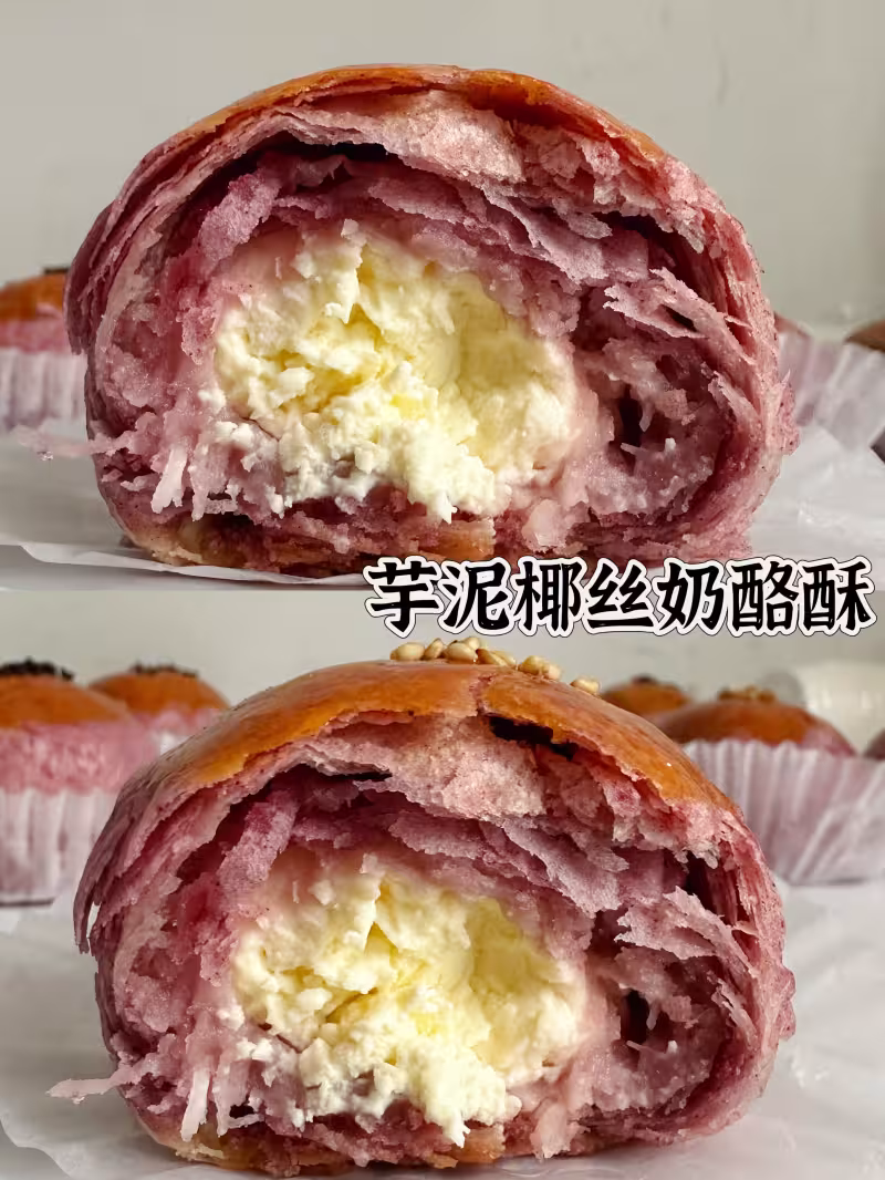 綿密的芋泥搭配椰香甜甜的椰絲條做餡包入奶酪球,還有酥掉渣的紫薯酥皮,口感豐富好吃到停不下來,安利凍啃奶酪絕了~