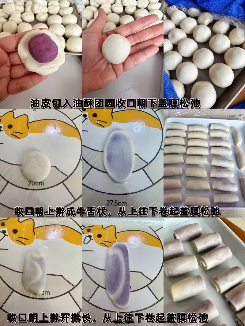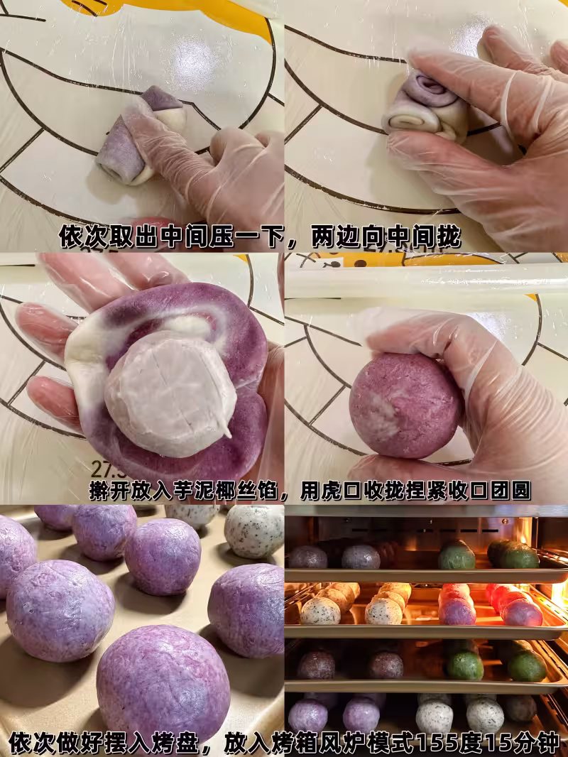 ✔️第一擀,收口向上擀成牛舌狀捲起,收口向下蓋膜靜置15分鐘。第二擀,收口向上,擀成長牛舌狀捲起靜置15分鐘。手指壓中間使兩端向中間靠攏,再把麵糰擀圓擀平。放入椰絲芋泥奶酪餡,後面用虎口收口。(可參考圖片哈)