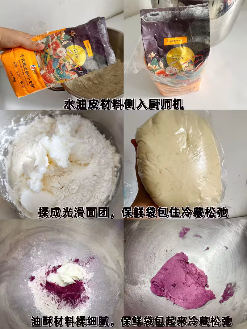 ✔️水油皮材料和油酥材料,分別倒入廚師機揉光滑,分別裝入保鮮袋放冰箱冷藏鬆弛30分鐘以上。