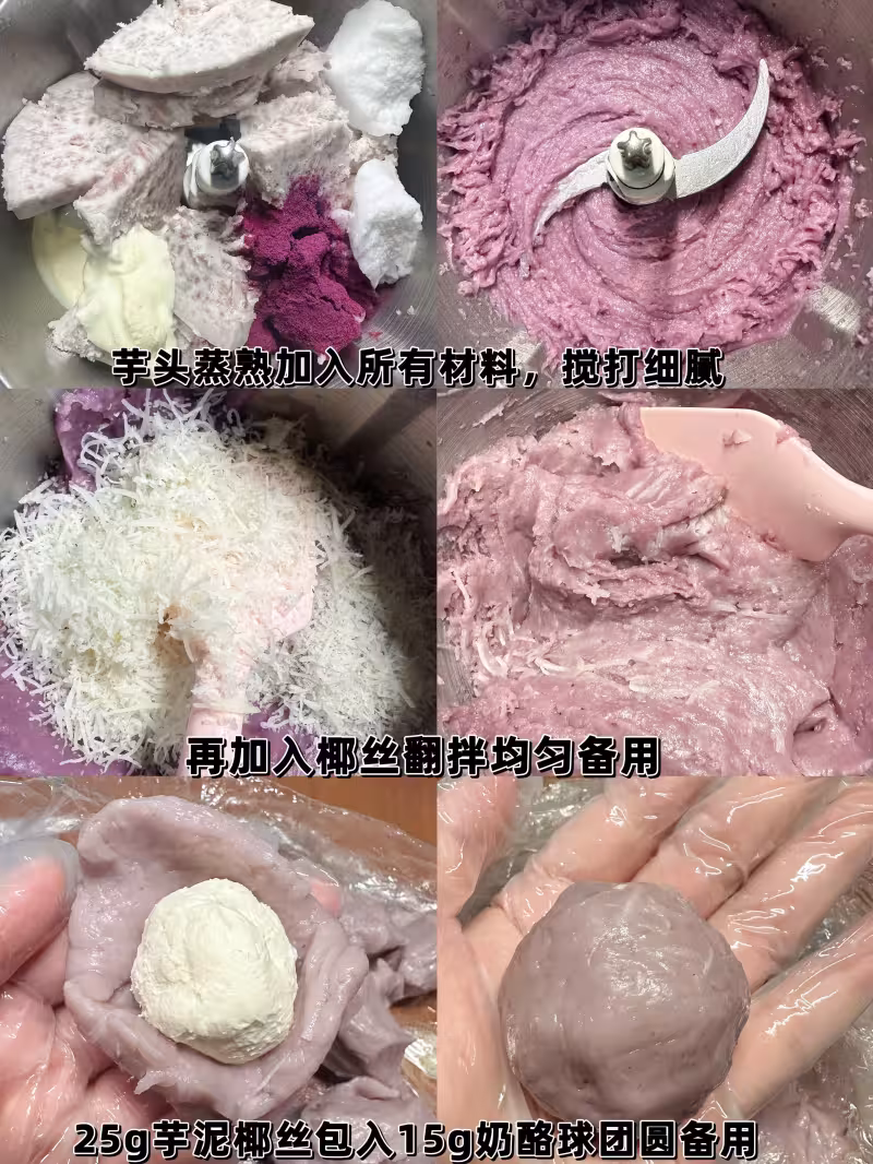 蒸熟荔浦芋頭500g,椰子油50g,紫薯粉4g,淡奶油48g,椰絲40g。