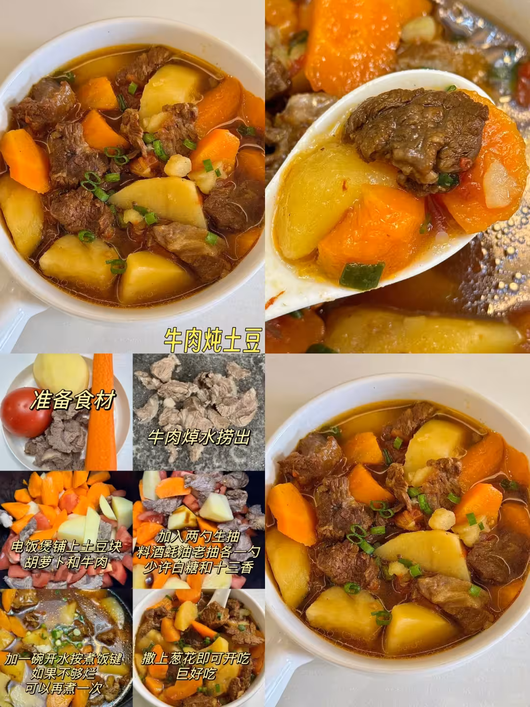 準備食材:土豆、胡蘿蔔、牛肉、番茄、蔥花 配料:生抽、料酒、蚝油、老抽、代糖、十三香
