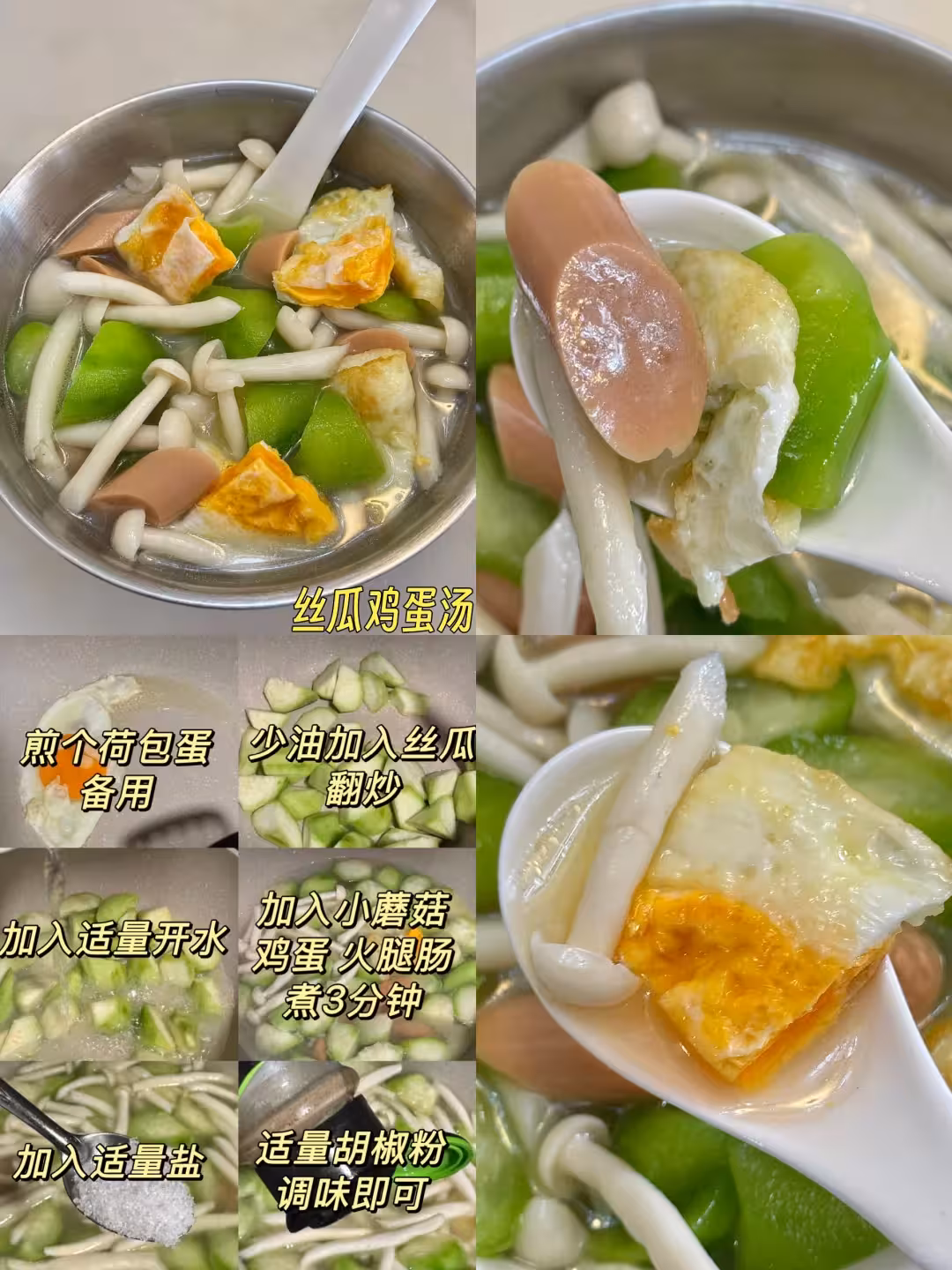 ✅第五款:絲瓜雞蛋湯 準備食材:雞蛋、絲瓜、火腿、平菇 配料:食鹽、胡椒粉