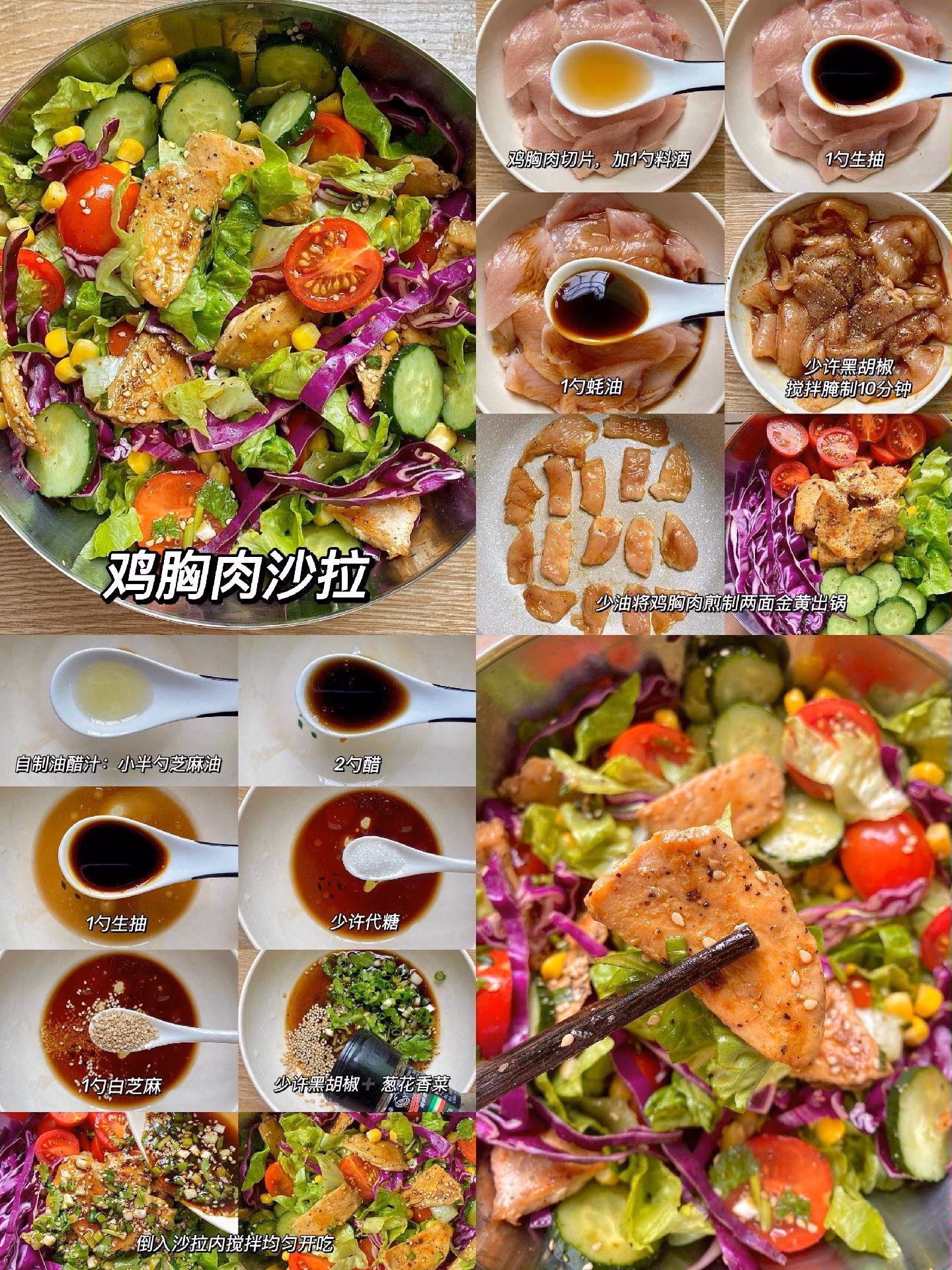 準備食材:雞胸肉、生菜、聖女果、紫甘藍、黃瓜、玉米、蔥花、香菜 配料:生抽、料酒、蚝油、胡椒粉、芝麻油、陳醋、生抽、代糖、白芝麻