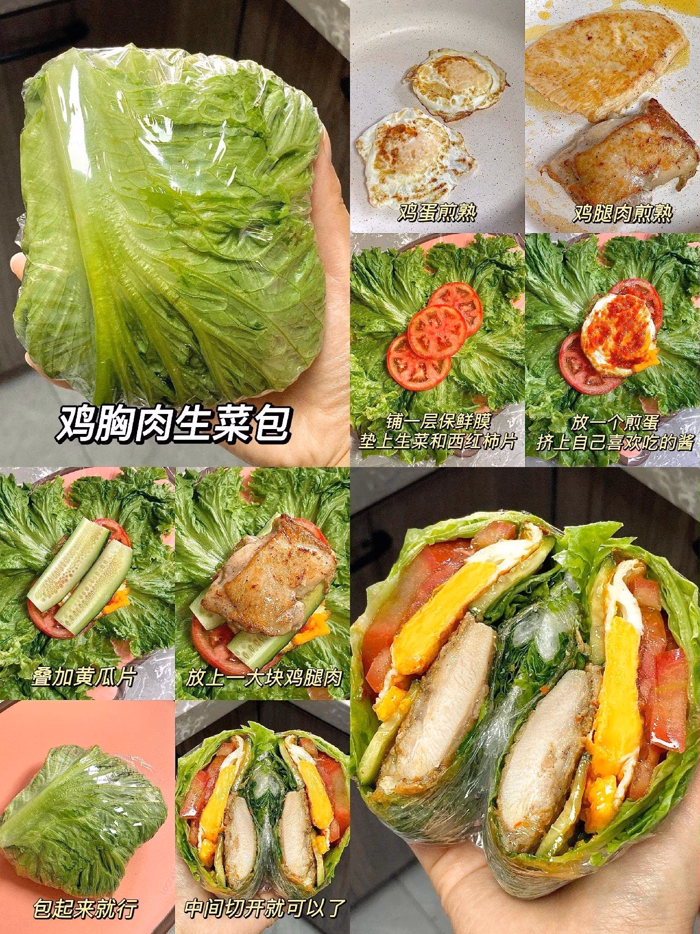 ✅第二款:雞胸肉生菜包 準備食材:雞胸肉、生菜、番茄、雞蛋、黃瓜 配料:辣醬或者番茄醬