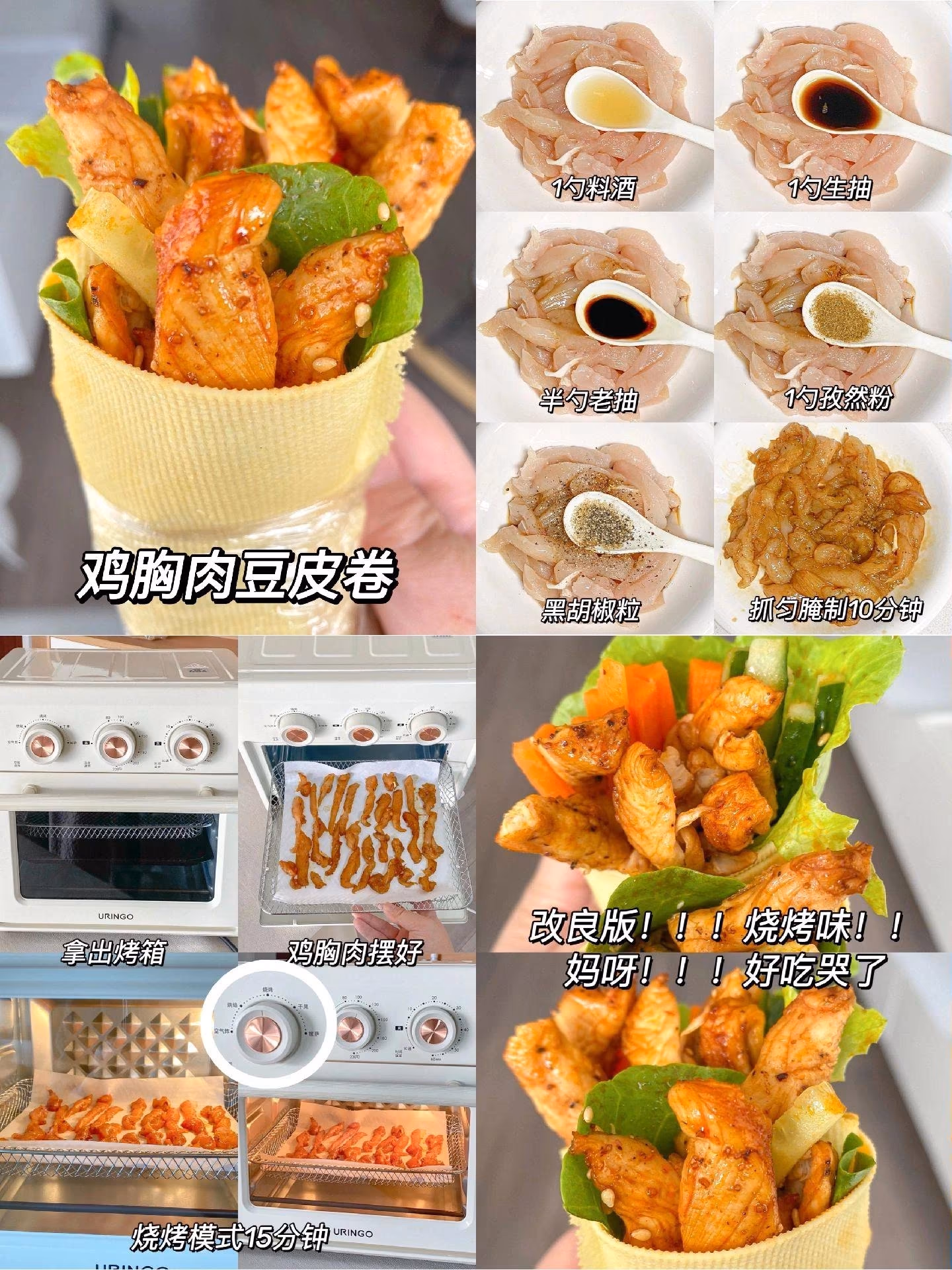 ✅第四款:雞胸肉豆皮卷 準備食材:雞胸肉、生菜、豆皮 配料:料酒、生菜、老抽、孜然粉、黑胡椒粒