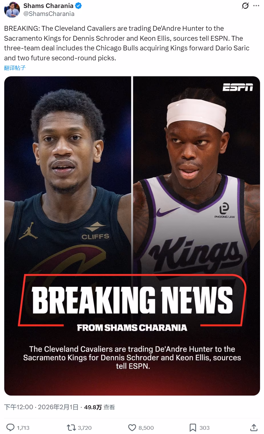 時間2月1日中午12點,據NBA名記Shams報道,騎士、國王和公牛達成一筆三方交易:騎士隊將德安德烈-亨特交易至薩克拉門托國王隊,換來丹尼斯-施洛德和基翁-埃利斯。此外,國王將薩里奇和2個次輪簽送到芝加哥公牛隊。