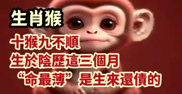生肖猴:十猴九不順,生於陰曆這三個月「命最薄」,是生來還債的。